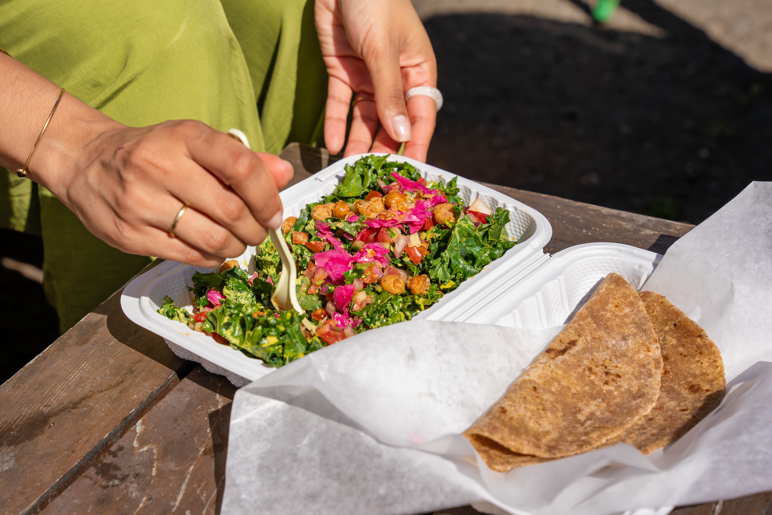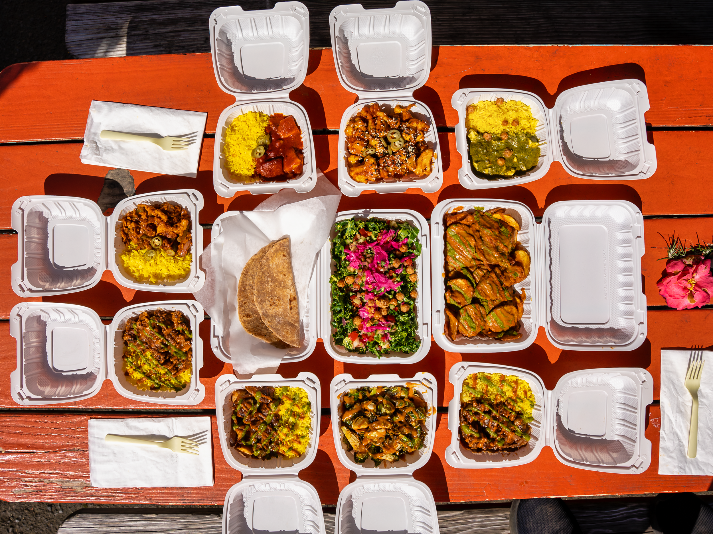 Includes one protein and rice , spinach dal, pickled cabbage, Indian salad, kale salad, tomato chutney and green chutney