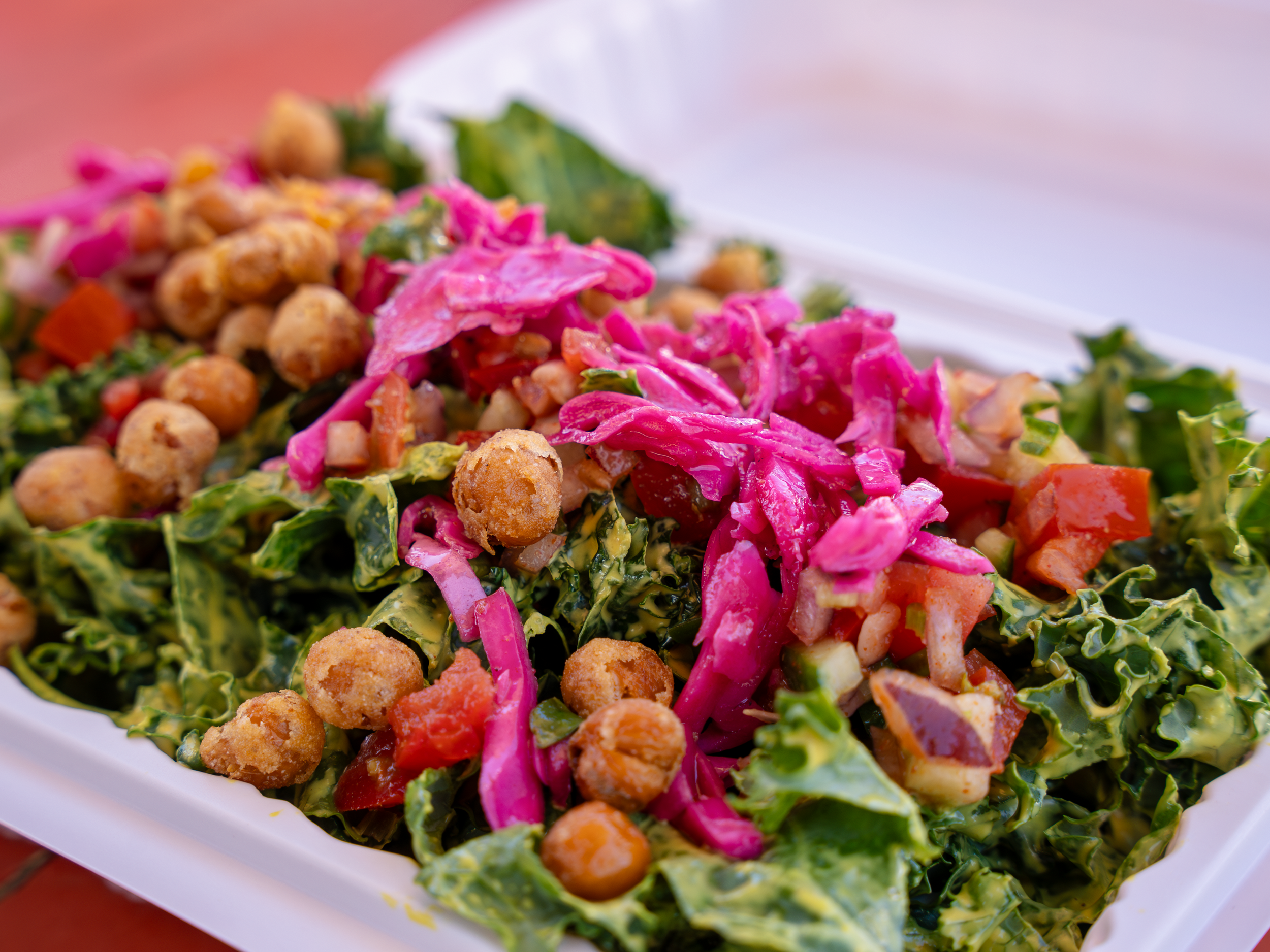 Crispy chickpeas, tomatoes, cucumbers, red onions, and pickled cabbage, over kale with a tahini dressing.